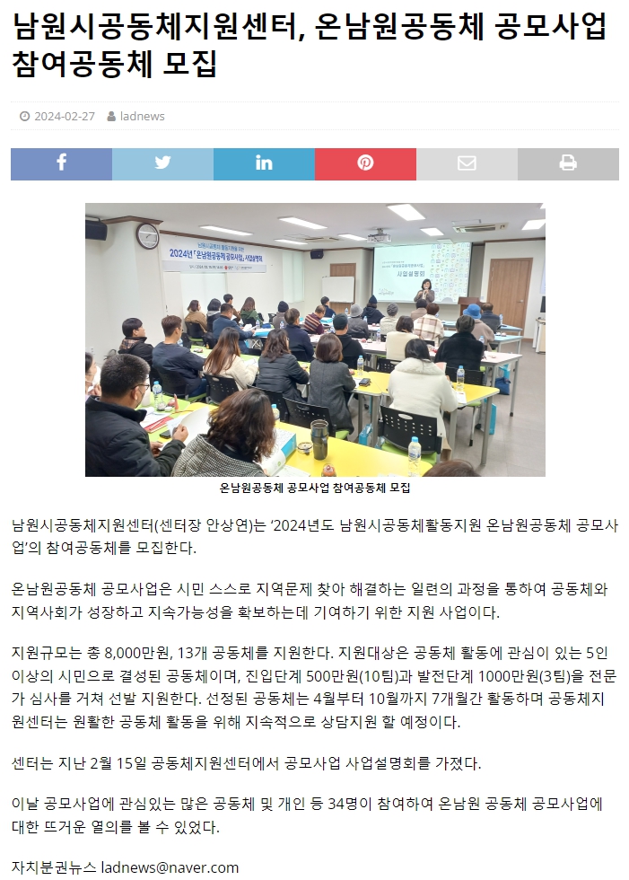 남원시공동체지원센터(센터장 안상연)는 ‘2024년도 남원시공동체활동지원 온남원공동체 공모사업’의 참여공동체를 모집한다.