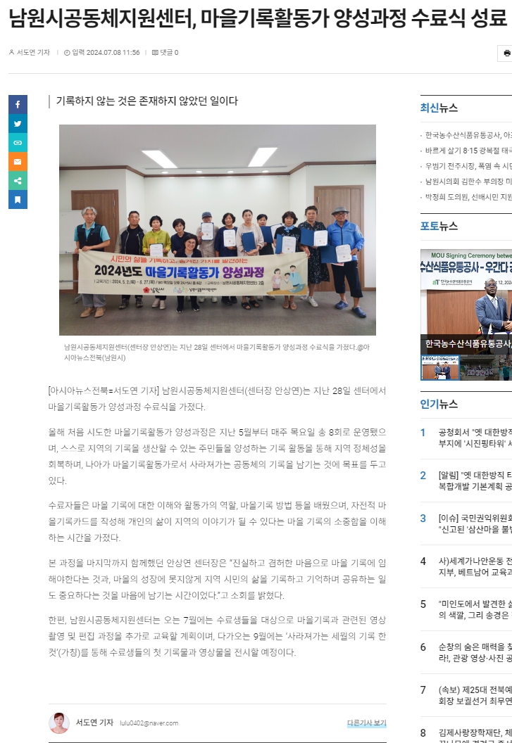 남원시공동체지원센터, 마을기록활동가 양성과정 수료식 성료