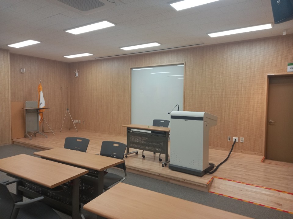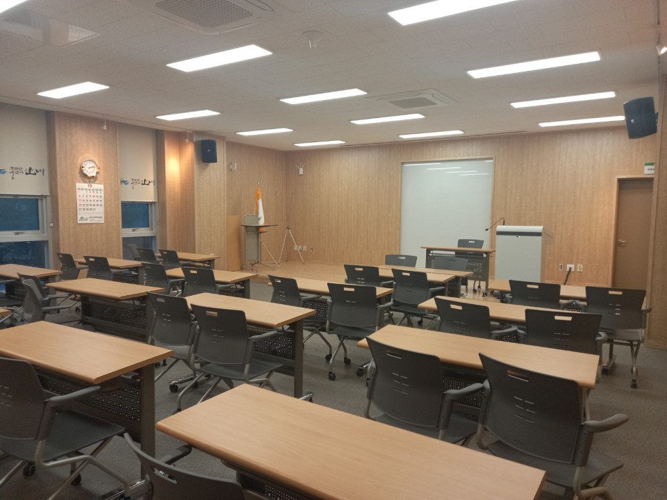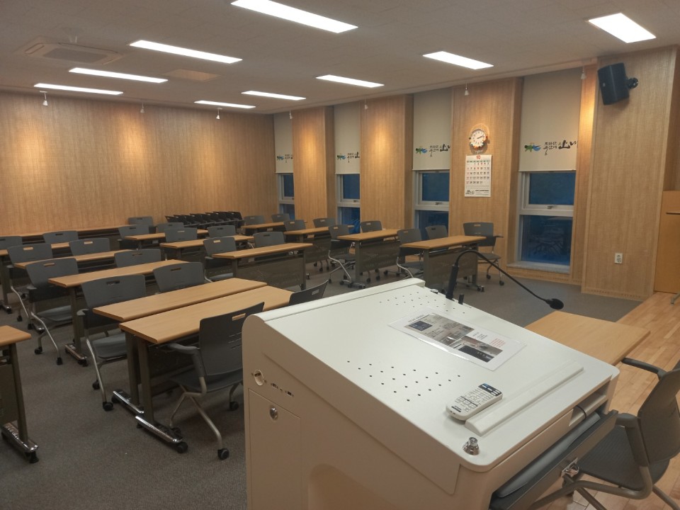 컴퓨터(노트북), 빔프로젝트, 음향, 마이크, WIFI, 테이블, 책상, 의자, 단상, 칠판, 난방