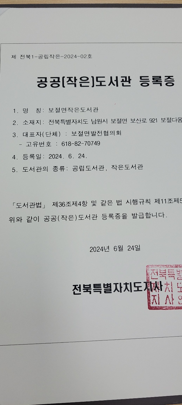 [보절면] 보절면 작은도서관 이전글 다음글 목록 본문 운영기관 보절면 발전위원회 전화번호 (비공개 요청) 수용인원 20명 이하 홈페이지 - 이용대상 해당지역민(읍·면·동) 주소 55706 전북특별자치도 남원시 보절면 보산로 921 (신파리) 운영시간 공간유형 강연(세미나), 모임, 공연, 도서관/책방 사용료 무료 신청방법 방문 주차가능여부 가능 부대시설 및 장비 조명, 마이크, WIFI, 테이블, 책상, 의자, 난방 유아동반 가능 시설상태 매우좋음 특이사항 내년부터 운영할 계획. (현재는 운영 안 함)